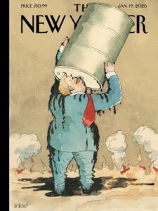 Ballina e revistës The New Yorker ofron një kritikë therëse vizuale përmes metaforës së pangopësisë dhe varësisë ndaj lëndëve djegëse fosile. Në planin e denotimit, shohim figurën karikaturale të Donald Trump-it duke “pirë” drejtpërdrejt nga një fuçi nafte, ndërsa lëngu i zi derdhet mbi kostumin e tij. Në rrafshin e konotimit, imazhi simbolizon politikat e tij dereguluese duke e paraqitur atë jo thjesht si mbështetës të industrisë së naftës, por si një konsumator të pangopur që po “mbytet” në të njëjtin burim.