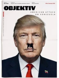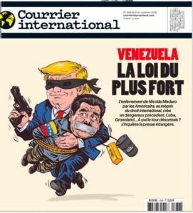Përmes një karikature satirike, revista Courrier International denoton Trump-in si një rrëmbyes që mban peng Nicolas Maduron, ndërsa synon naftën dhe arin. Lidhja e syve dhe pistoleta në dorë konotojnë apetitin gjeopolitik dhe shpërfilljen e të drejtës ndërkombëtare. Courrier International, duke qenë një botim që përmbledh shtypin botëror, përdor këtë gjuhë vizuale për të treguar se si bota e percepton politikën amerikane ku mbizotëron vetëm forca.
