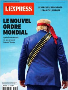 Ballina e L’Express e paraqet Trump-in nga pas, me një rrip plumbash mbi supe dhe sytë e lidhur me një rrobë të kuqe. Denotimi i rripit të municionit dhe lidhëses konoton një militarizëm të verbër dhe hakmarrës, ku forca përdoret pa pasur një vizion të qartë strategjik. Si një revistë e qendrës së djathtë neoliberale, L’Express e portretizon këtë “Rend të Ri Botëror” si një pari të rrezikshme, ku lideri vepron si një figurë e vetmuar luftarake që i ka kthyer shpinën diplomacisë tradicionale europiane.