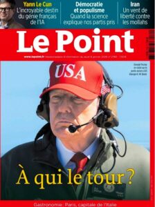Le Point zgjedh një fotografi më “operacionale”, ku Trump-i mban një kapele “USA” dhe kufje komunikimi gjatë një vizite në një aeroplanmbajtëse. Titulli “À qui le tour?” (Kush e ka radhën?) konoton një strategji ekspansioniste dhe një gatishmëri për ndërhyrje ushtarake. Ideologjikisht, kjo revistë e së djathtës konservatore fokusohet te fuqia ekzekutive dhe forca e SHBA-së si një fakt i kryer, duke e paraqitur Trump-in më shumë si një komandant në terren sesa si një politikan të zyrave.