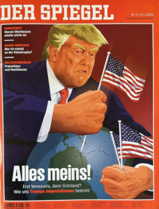 Revista gjermane Der Spiegel, e njohur për orientimin e saj liberal-progresist dhe kritik ndaj autoritarizmit, e portretizon Trump-in si figurë ekspansioniste që mban në krah globin dhe kërkon hapësira ku të ngulë flamurin amerikan. Titulli “të gjitha të mijat” dhe nëntitulli që lidh Venezuelën me Grenlandën, e lexojnë politikën e Trump-it si vazhdimësi të një mendësie perandorake që rrezikon rendin ndërkombëtar. Në këtë semiotikë, globi nuk është më simbol i bashkëpunimit, por i pronësisë, ndërsa flamuri shndërrohet nga shenjë identitare në mjet synimi. Editoriali i Spiegel-it e zhvendos mesazhin nga frika drejt thirrjes për reagim: Europa, në një botë ku dominon forca, duhet ta mësojë gjuhën e fuqisë për të mbrojtur vlerat dhe interesat e saj.